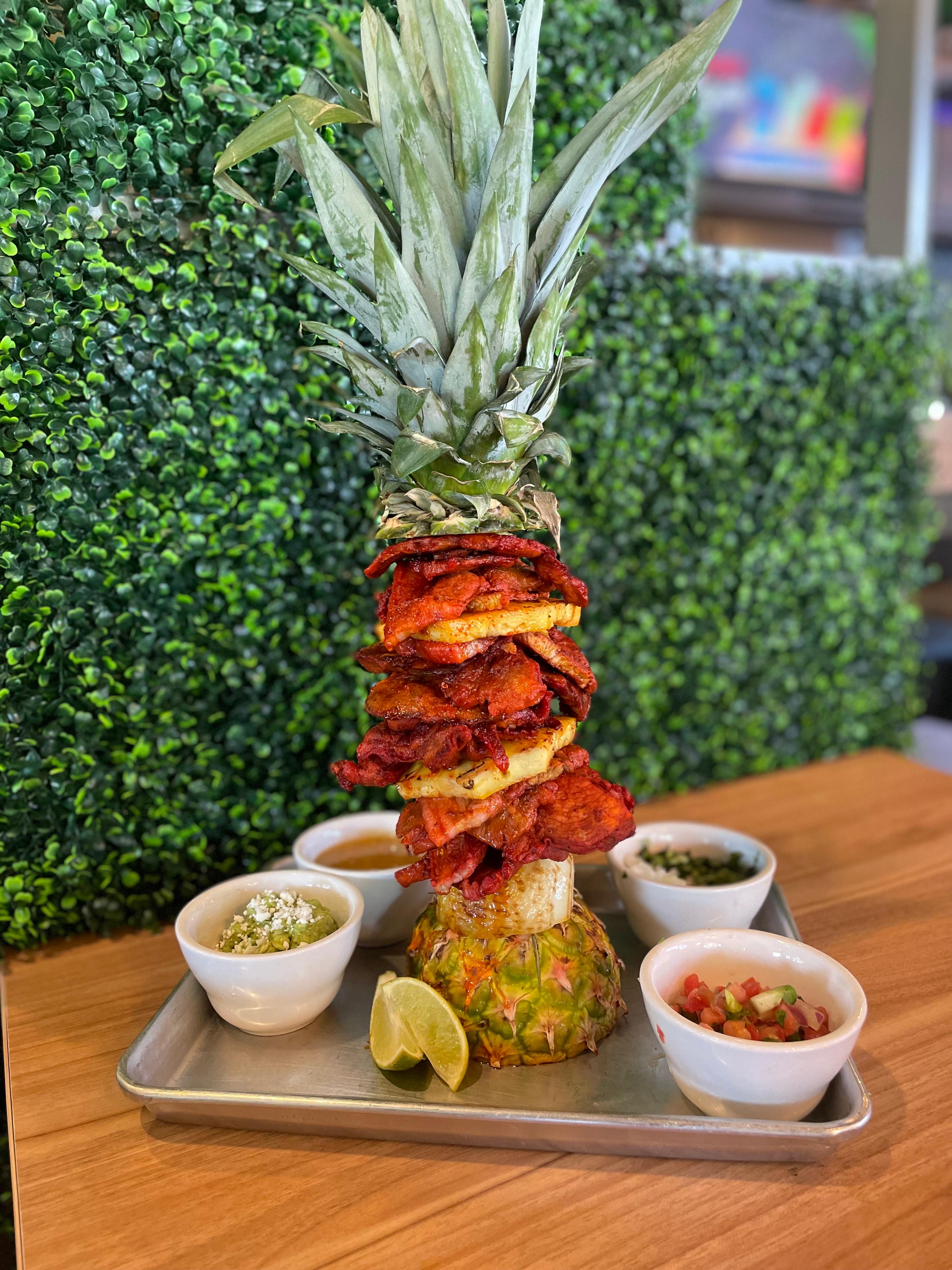 Al pastor / grilled pineapple / grilled onions / pico de gallo / guacamole / salsa / limes / corn tortillas
