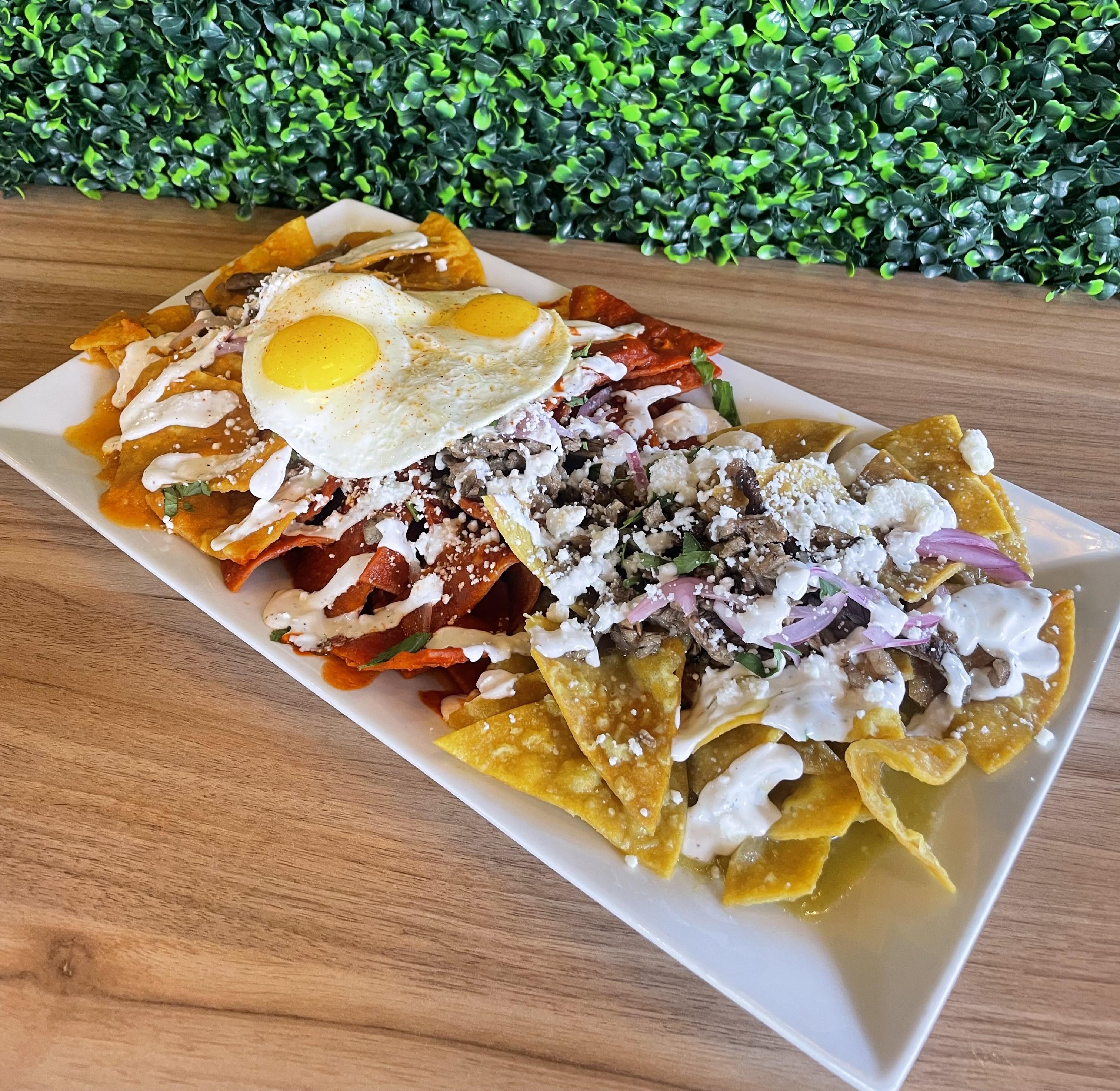 tortilla chips / red sauce / green sauce / Juarez sauce / 2 eggs over medium / crema / queso fresco / red onion / cilantro